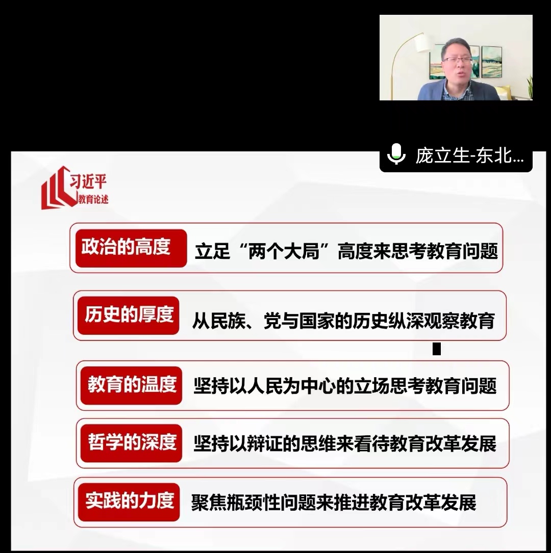 为推进我校习近平教育重要论述课程的建设,2月26日,东北师范大学马克思主义学部部长庞立生教授受邀为我校承担该门课程建设任务的老师开展了一次课程指导讲座。讲座采用线上的模式进行,会议由我校马成人视频