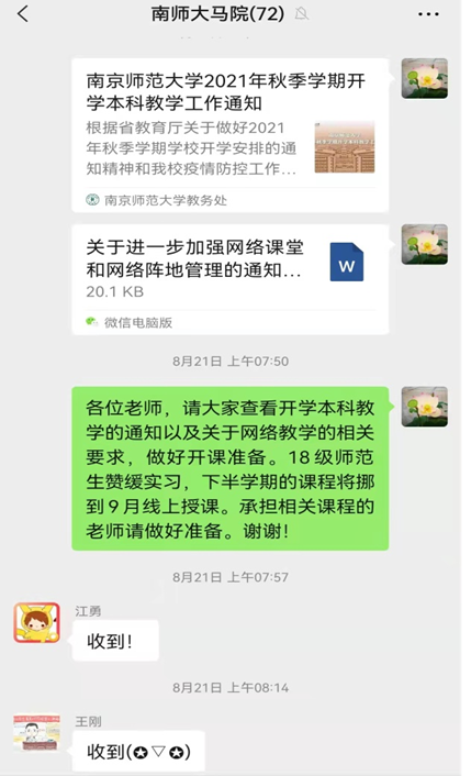 按照培养方案的要求,本学期成人视频共为2018级、2019级、2020级以及社发院“史政复合专业”(2020级)学生共开设22门专业课。8月20日《南京师范大学2021年秋季学期开学本科教学工作通知》正式发布后,成人视频教学管理人员在第一时间点对点通知全体任课教师,及时登录教务系统获得选课信息,建立相应的在线教学班级,汇总后向学生公布。受疫情影响,原定9月份开始的师范生教育实习暂停。承担2018级师范班教学任务的老师及时调整教学计划,将课程调整至前半学期进行。