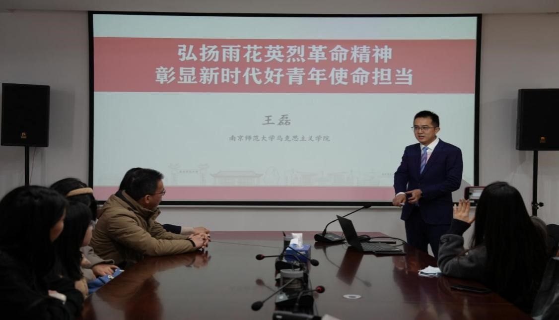 教授王磊老师的领学讲解中拉开帷幕。在雨花台烈士陵园的研究中心里,王磊老师深情地告诉同学们,雨花台烈士陵园是一座非常特殊的国家级烈士陵园,在这里牺牲的烈士们多数都家境好、学历高,平均年龄不到30岁。而且,他们每个人在牺牲前都经历了生死考验。王磊老师说,在那个年代,雨花台是“对信仰的终极检验”,崇高理想信念、高尚道德情操、为民牺牲的大无畏精神是雨花英烈之魂。王磊老师指出,雨花英烈精神是中国共产党人宝贵的精神财富,当代青年学生要继承革命先烈的遗志,坚定对马克思主义的信仰、对中国特色社会主义的信念和对实现中华民族伟大复兴的信心,在“强国有我”的使命担当中赓续红色血脉。