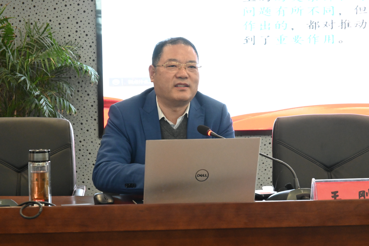院长王刚以“全面总结党的百年奋斗重大成就和历史经验,开启全面建设社会主义现代化国家的新征程”为题作专题报告。他以党的历史上两大重要决议为切入点,将历史照进现实,着重围绕党的十九届六中全会通过的《中共中央关于党的百年奋斗重大成就和历史经验的决议》展开详细论述。王刚从历史维度对三个历史决议的沿革关系进行详细阐述,深刻剖析了处在历史交汇点上的第三个历史决议出台的重大意义;对《决议》的主要内容进行归纳整理,将其分为总结党的百年奋斗重大成就和历史经验的必要性、党的百年奋斗取得的重大成就等六个方面,以史论结合的方式娓娓道来。最后,王刚从马克思主义理论学科出发,在《决议》文本基础上进行了提炼升华,为同学们提供了多角度、多层次的学术研究方向。报告对党的十九届六中全会精神的剖析阐释深中肯綮,广博深刻的分析中蕴含着真知灼见,使在场师生受益匪浅,为大家的党史学习和科学研究提供了诸多新思路和新方向。