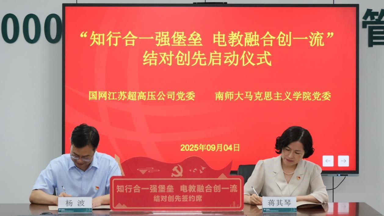 随后,蒋其琴与杨波共同签订《南京师范大学马成人视频 和国网江苏超高压公司结对创先协议书》,并为江苏高校“青蓝工程”优秀教学团队大思政课协同创新实践基地揭牌。