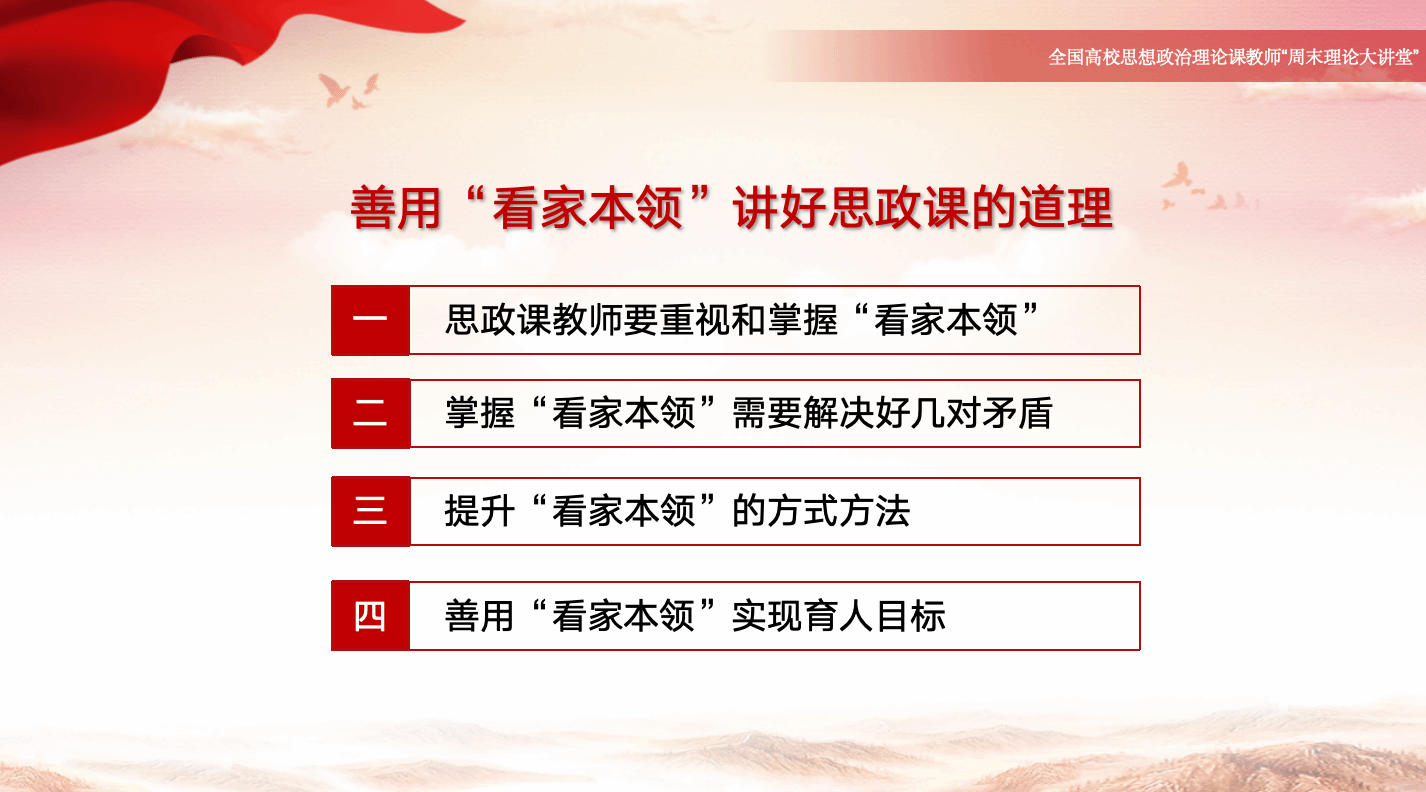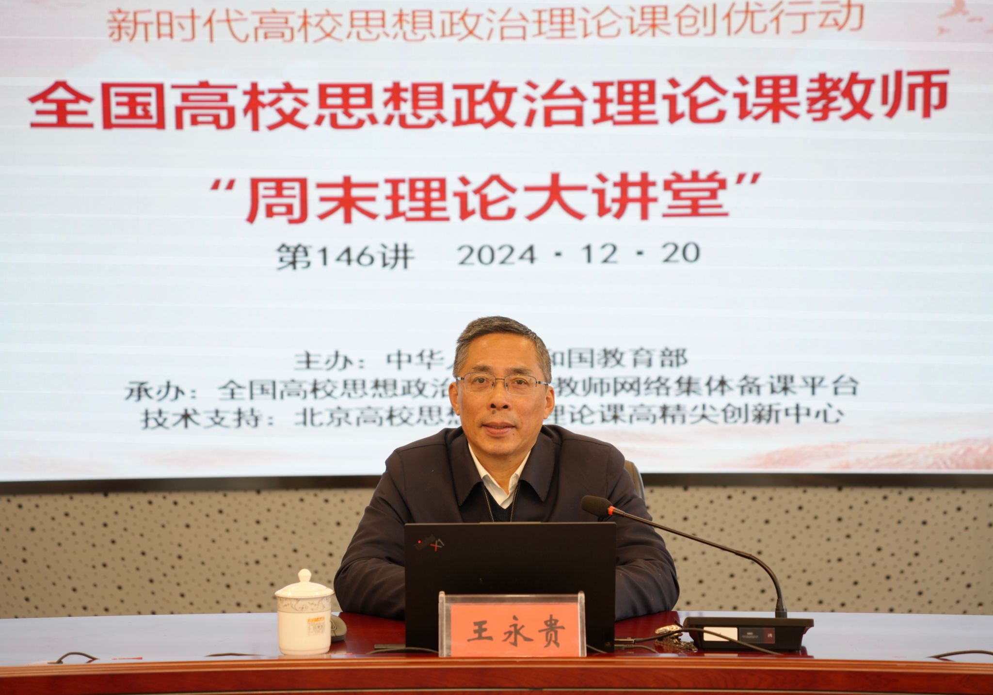 2024年12月20日下午,由中华人民共和国教育部主办、全国高校思想政治理论课教师网络集体备课平台承办的第146期全国高校思想政治理论课教师“周末理论大讲堂”在全国高校思想政治理论课教师网络集体备课平台向全国进行直播。我校王永贵教授应邀讲授“补短板·理论”课程,作了以“善用‘看家本领’讲好思政课的道理”为题的报告。