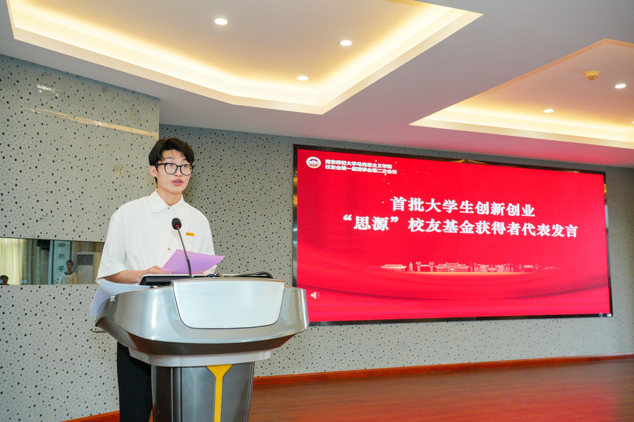 2024级硕士研究生杜文昊作为学生代表发言。他回顾了自己的科研创新历程,以“迈出第一步、迈大每一步、迈稳每一步”概括其成长轨迹。他表示,“思源”校友基金不仅给予学生物质支持,更让马克思主义的旗帜在一代代青年的手中传递下去,以专业知识回报社会、以反哺之心回报母校,让“思源”的精神在代际传承中生生不息。