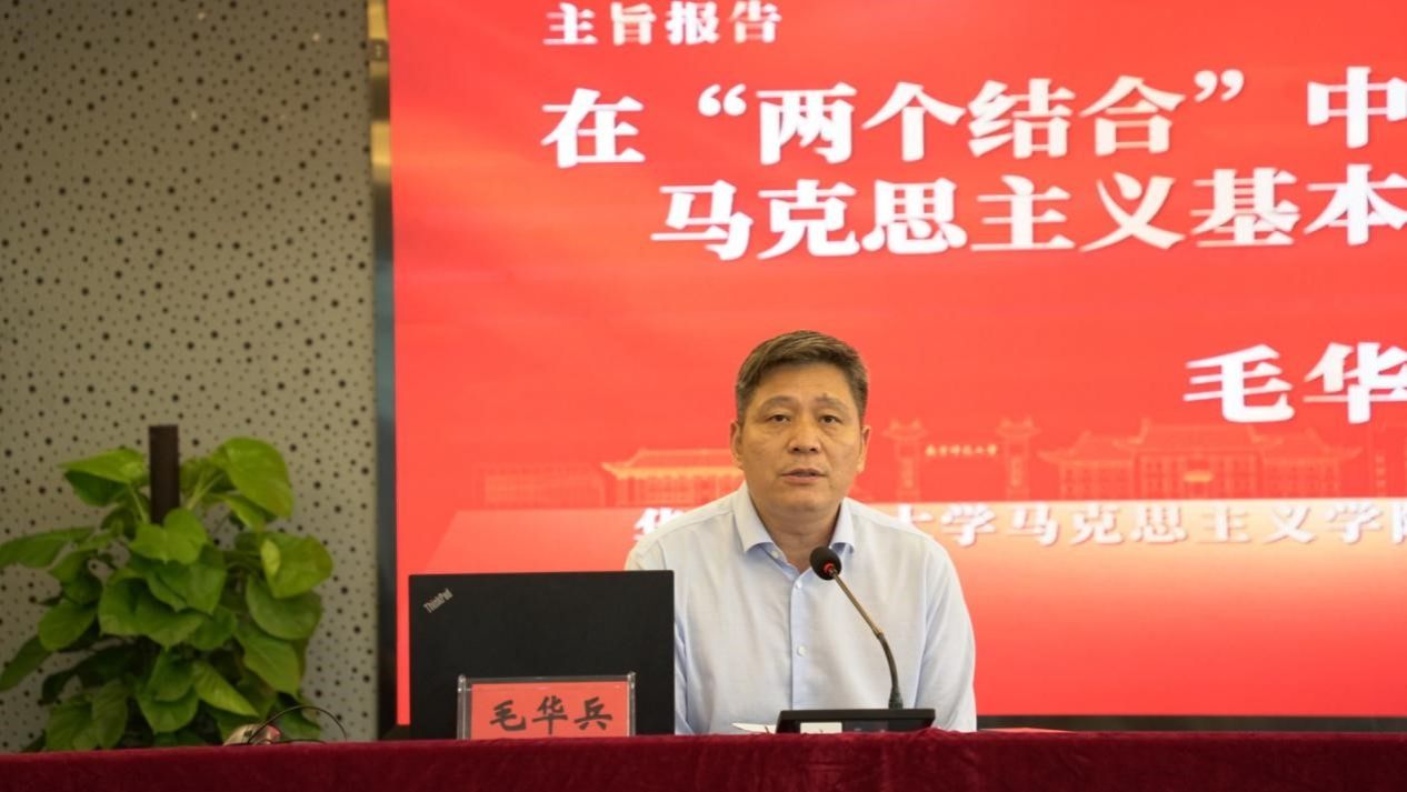 院长毛华兵提出“两个结合”解决了理论与现实的互动问题、理论与文化传承的创新问题,是建构中国自主的马克思主义基本原理知识体系的根本遵循,要在处理好守正与创新、传统与现代、中国与世界的三对关系基础上,以最新理论成果为引领、聚焦中国式现代化实践、深入挖掘传统文化精华、注重理论体系的创新化与本土化。