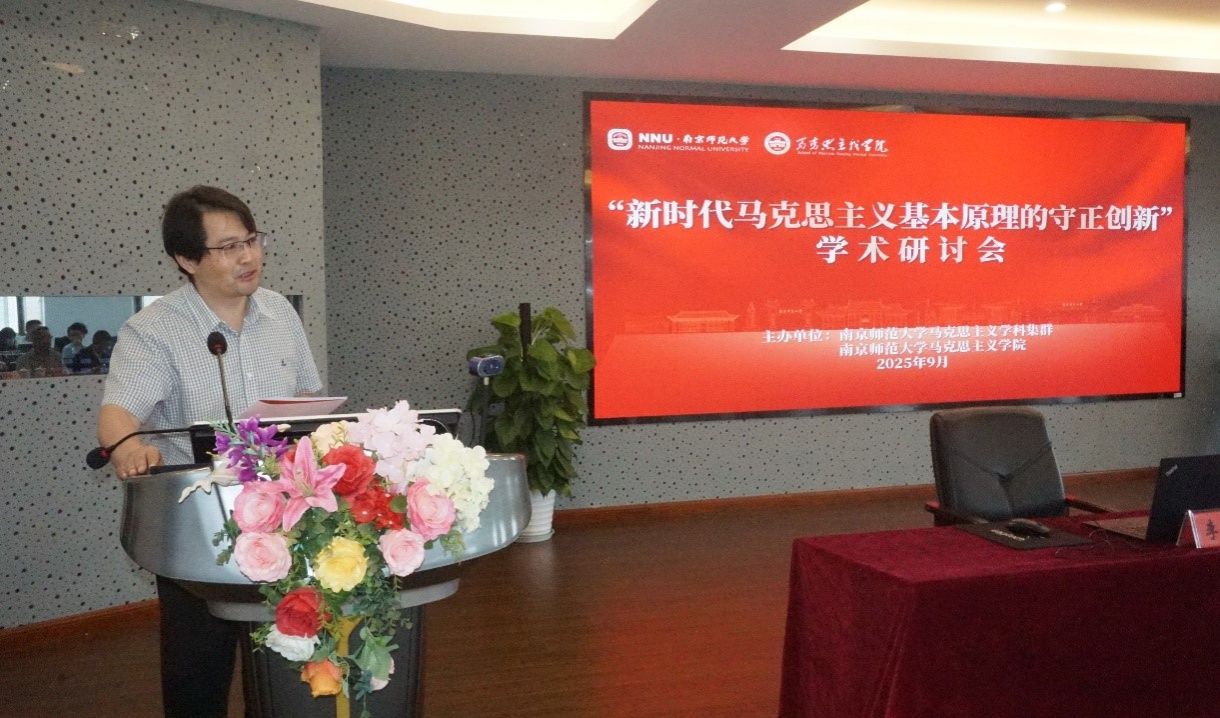 南京师范大学党委常委、宣传部部长宋喆代表学校致辞,他向与会专家表示热烈的欢迎和衷心的感谢,并简要介绍学校发展历史和马克思主义理论学科的建设情况。他指出,当前我们正处于中华民族伟大复兴战略全局和世界百年未有之大变局的关键时期,当代中国正经历人类历史上最为宏大、独特的实践创新,新情况、新问题层出不穷,我们要在坚守马克思主义基本原理这一根本前提下,勇于推进理论创新,才能科学回答中国之问、世界之问、人民之问、时代之问。他强调一部马克思主义发展史就是一部在守正中创新、在创新中守正的历史,我们要根据新的实践形势、新的时代要求,不断推动马克思主义基本原理的创新发展,以其科学的理论力量为人类探索更美好的社会制度贡献中国智慧与中国方案。