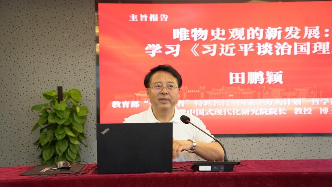 东北大学中国式现代化研究院院长田鹏颖提出习近平新时代中国特色社会主义思想的理论支点是唯物史观及其新的发展,强调《习近平谈治国理政》五卷本所提出的在总体上把握社会基本矛盾,是一种新的理解和阐释,衍生出了经典唯物史观里的许多重大创新。